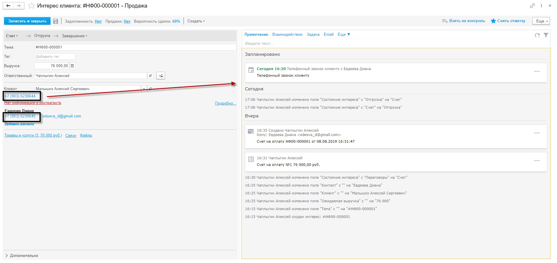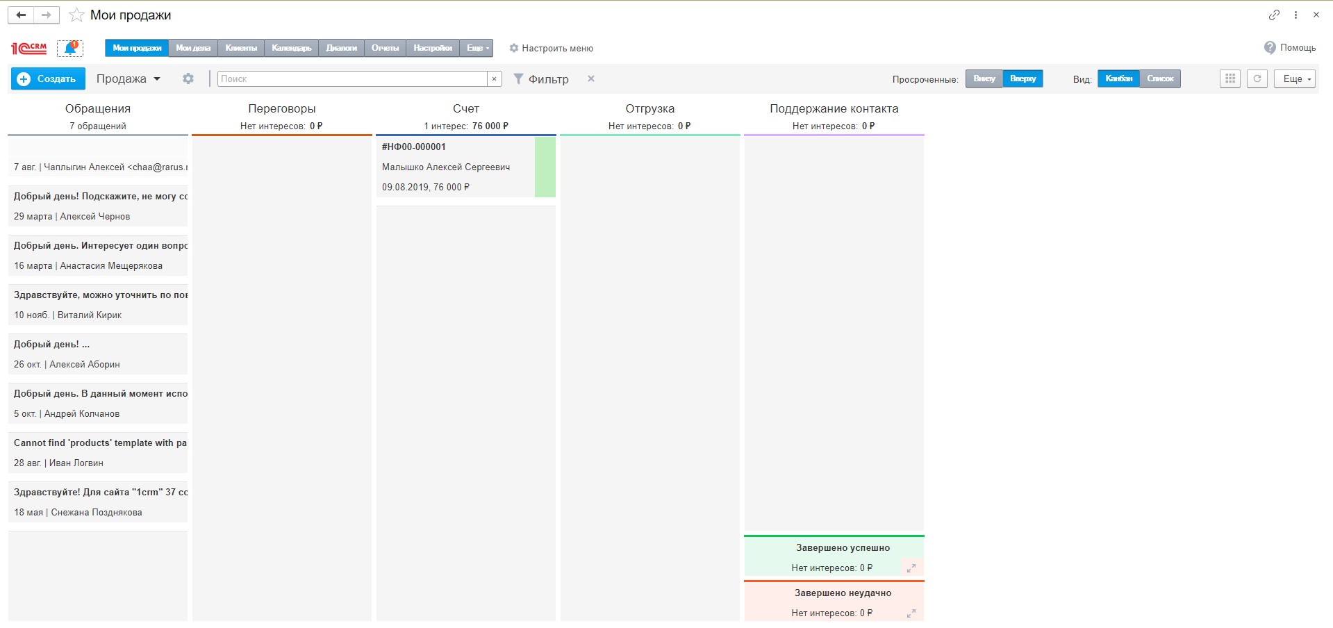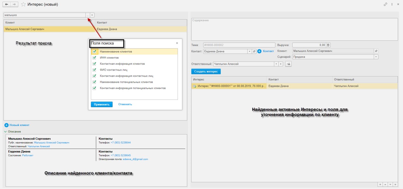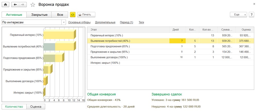 - Управления стадиями и этапами продажи на основе документа «Интерес» и контроля состояний
