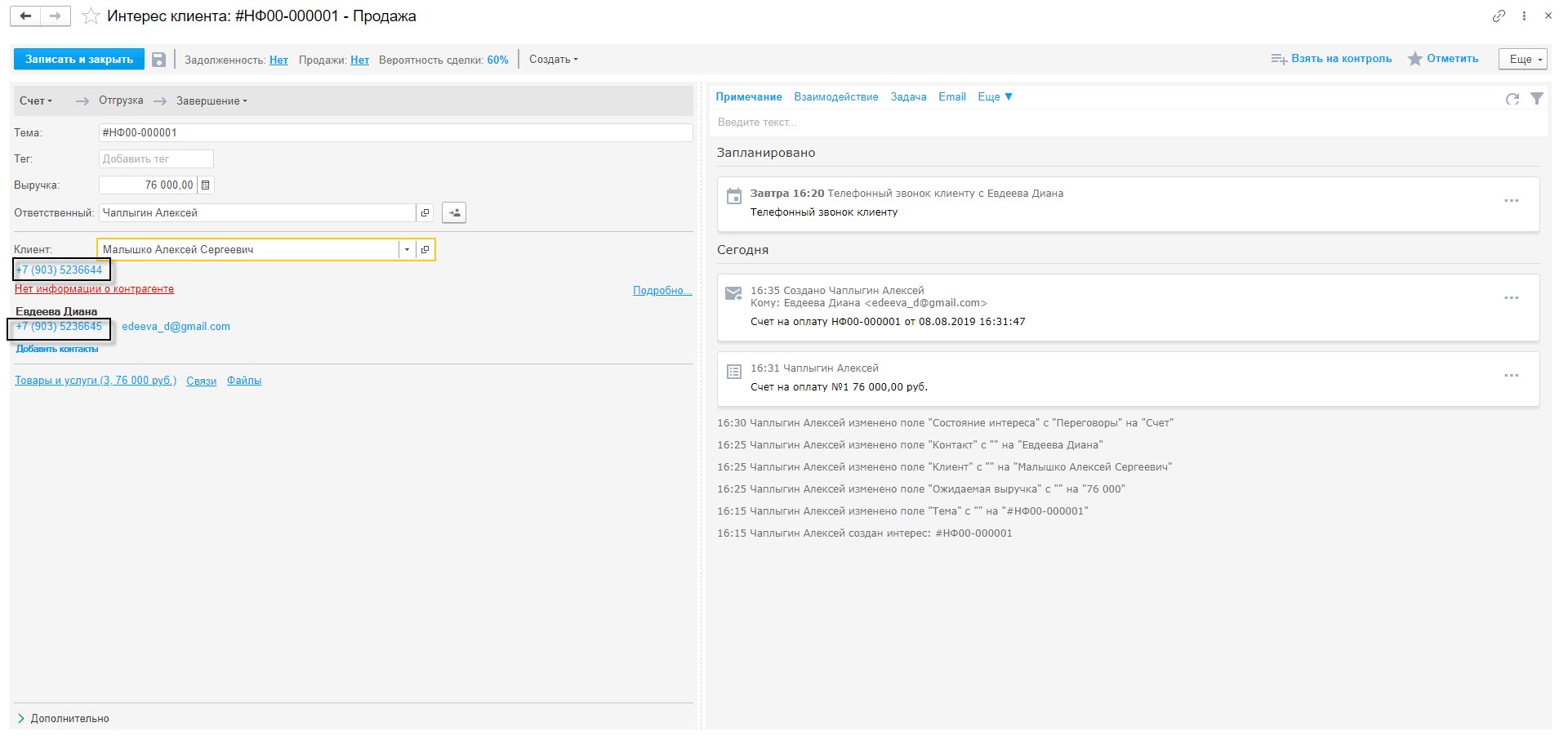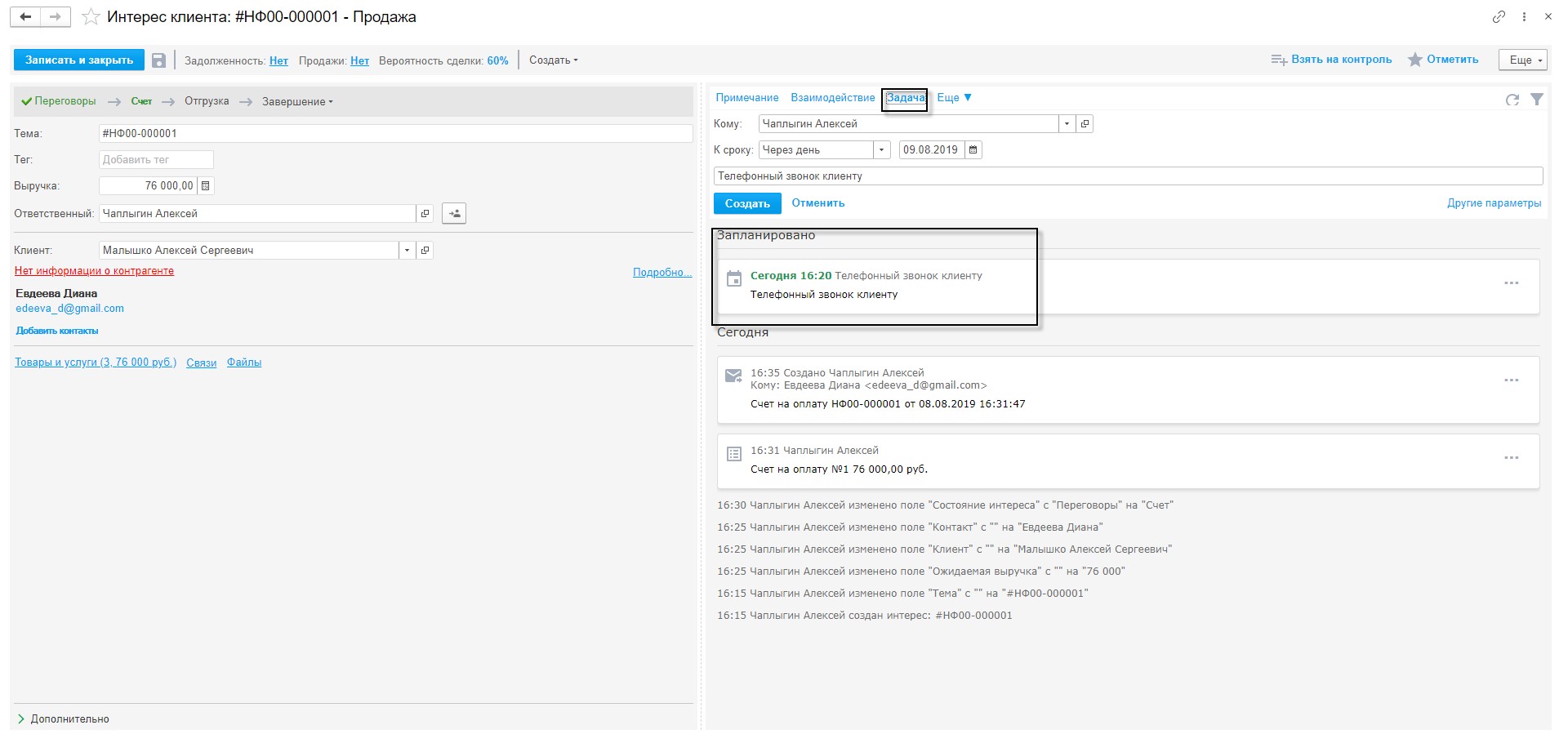 - Автосоздание задачи для отработки сотрудником при переводе Интереса в новое состояние (этап «Воронки продаж»)