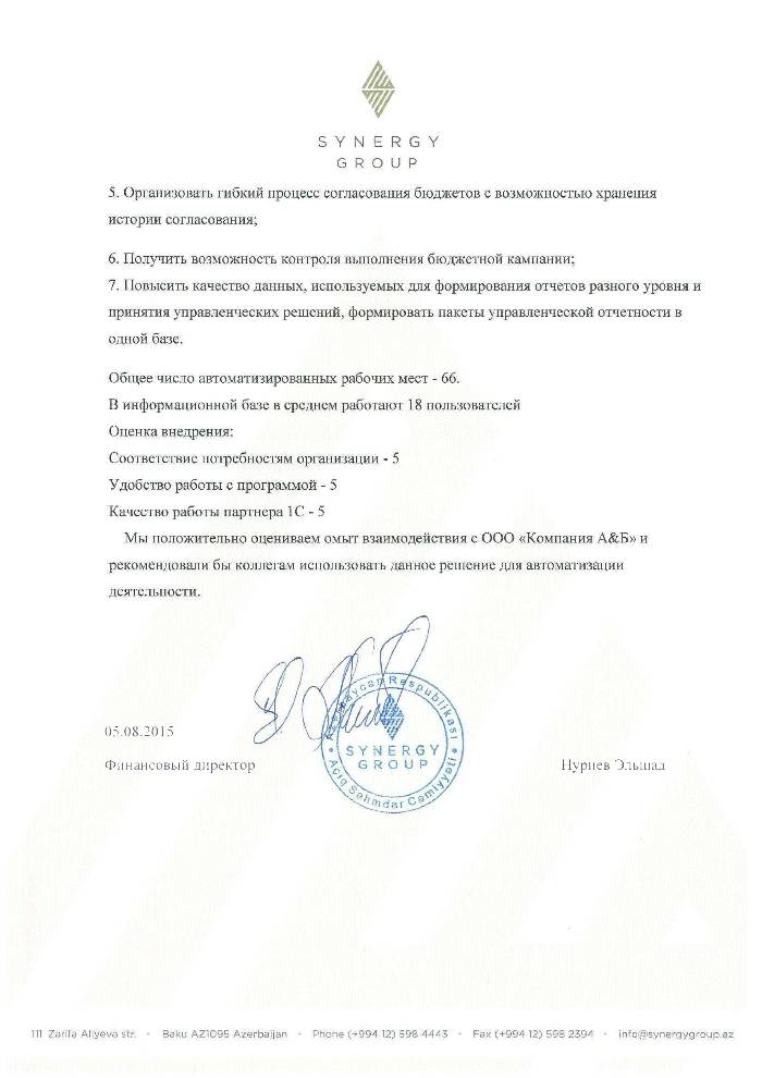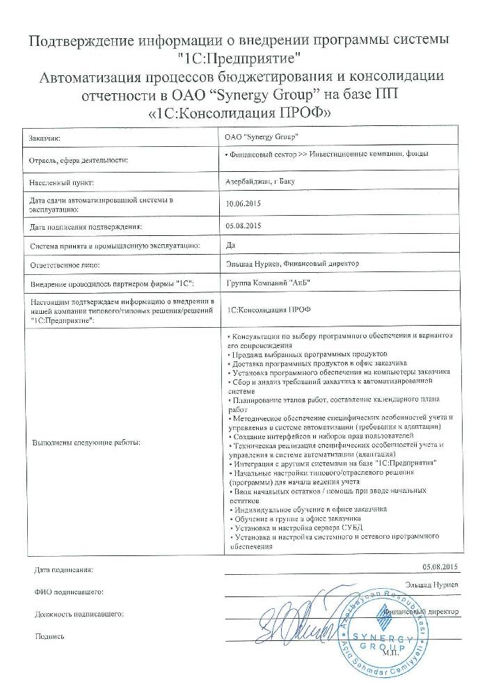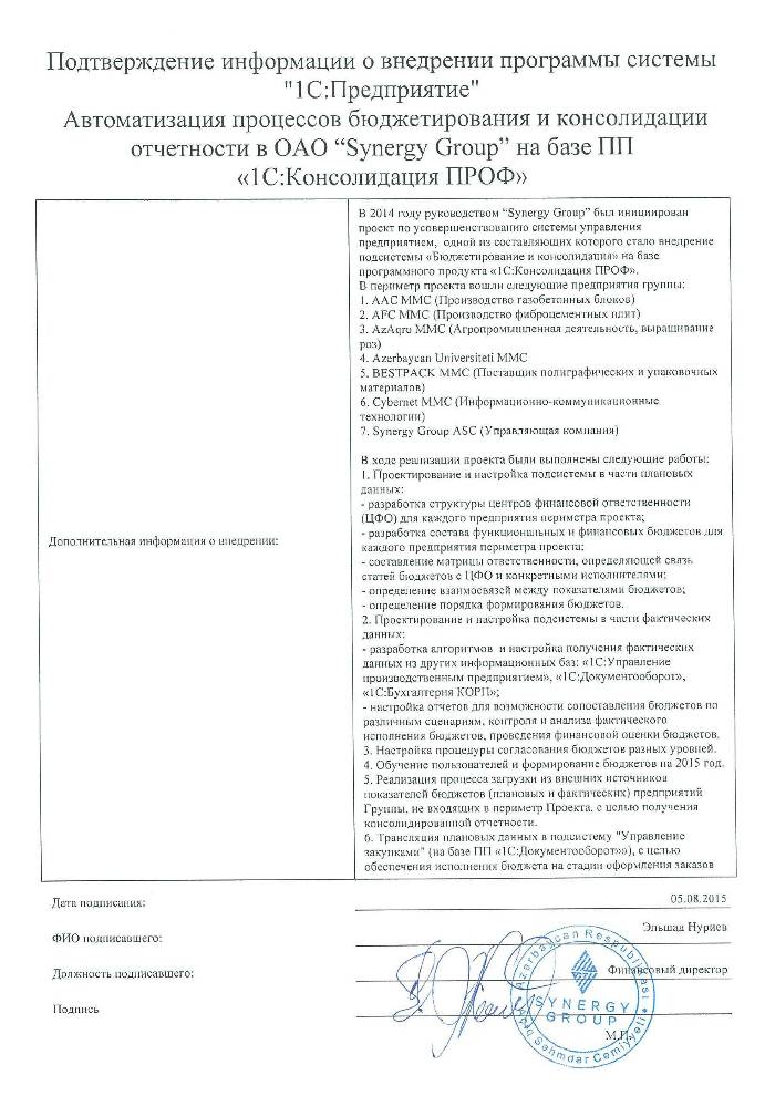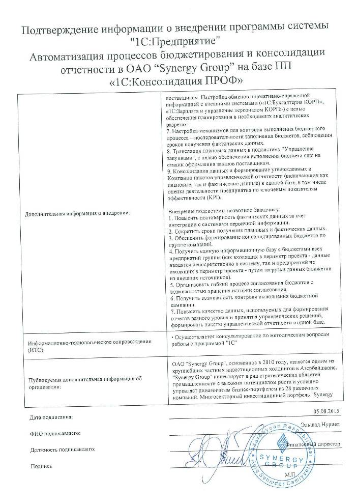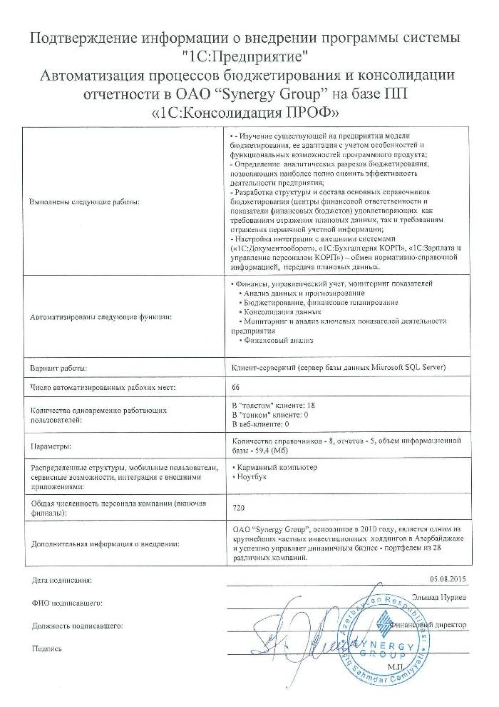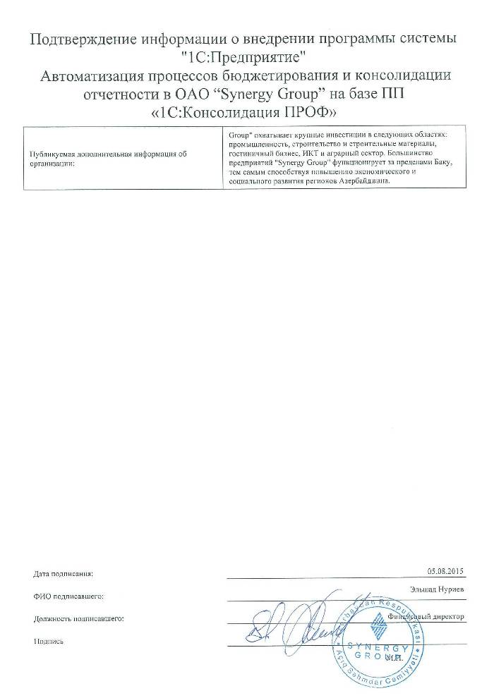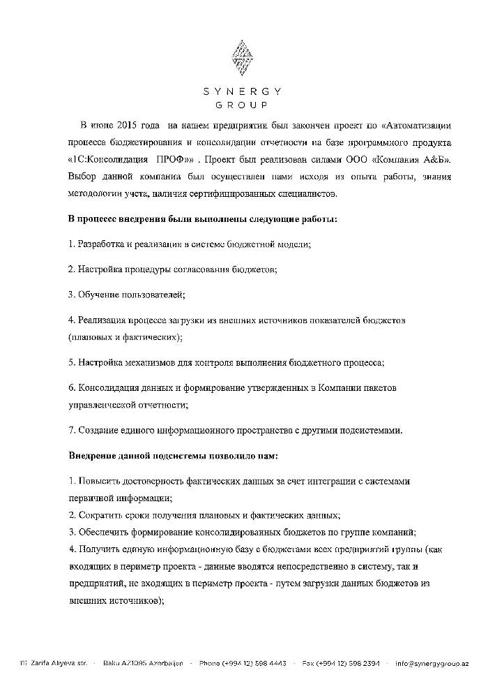 В 2014 году руководством “Synergy Group” был инициирован проект по усовершенствованию системы управления предприятием, одной из составляющих которого стало внедрение подсистемы «Бюджетирование и консолидация» на базе программного продукта «1С:Консолидация ПРОФ».